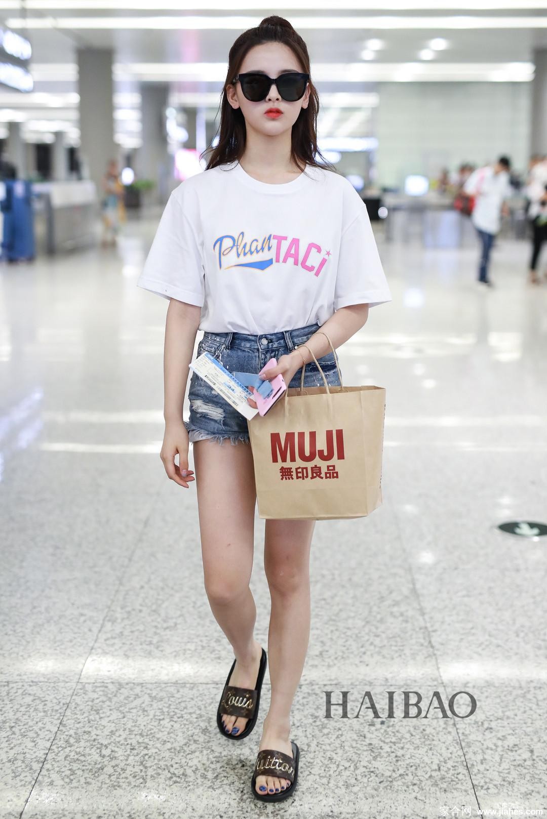 杨超越漫步林荫道 牛仔短裤与透明凉鞋搭配凸显时尚小心机