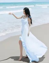 浅蓝色,是天空倒映在海面的颜色,也是这组写真的主旋律。那条轻盈的吊带长裙,采用垂感极佳的面料,随着海风的节奏自由舞动。两根纤细的肩带勾勒出优美的肩颈线条,简约的设计反而突显了穿着者本身的气质。裙摆处时而随风扬起,如海浪般起伏;时而轻抚沙滩,留下温柔的褶皱。这种介于精致与随性之间的着装,与海边的氛围完美契合——既不失仪式感,又拥有与自然对话的松弛。